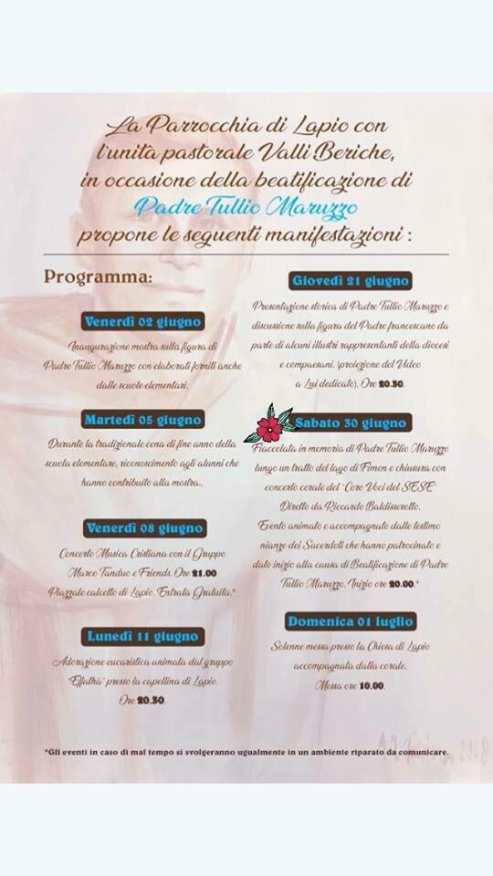 Padre Tullio Maruzzo30/06/2018Dalle ore 20:00Lago di Fimon ( VI )Fiaccolata lungo il Lago Fimon e concerto del Coro Voci del Sese. Galleria immagini